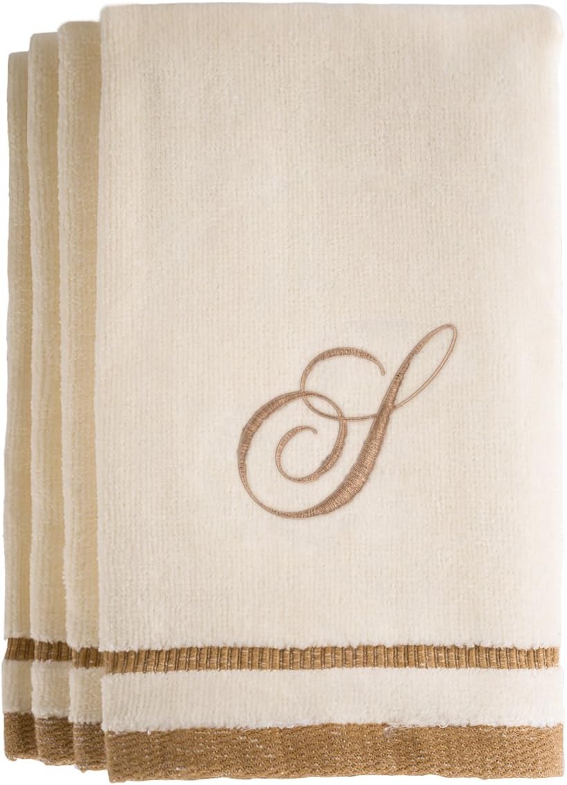 Monogrammed Gifts, Fingertip Towels, 11 x 18 Inches - Set of 4- Decorative Golden Brown Embroidered Towel - Extra Absorbent 100% Cotton- Personalized Gift- For Bathroom/ Kitchen- Initial S (Ivory)