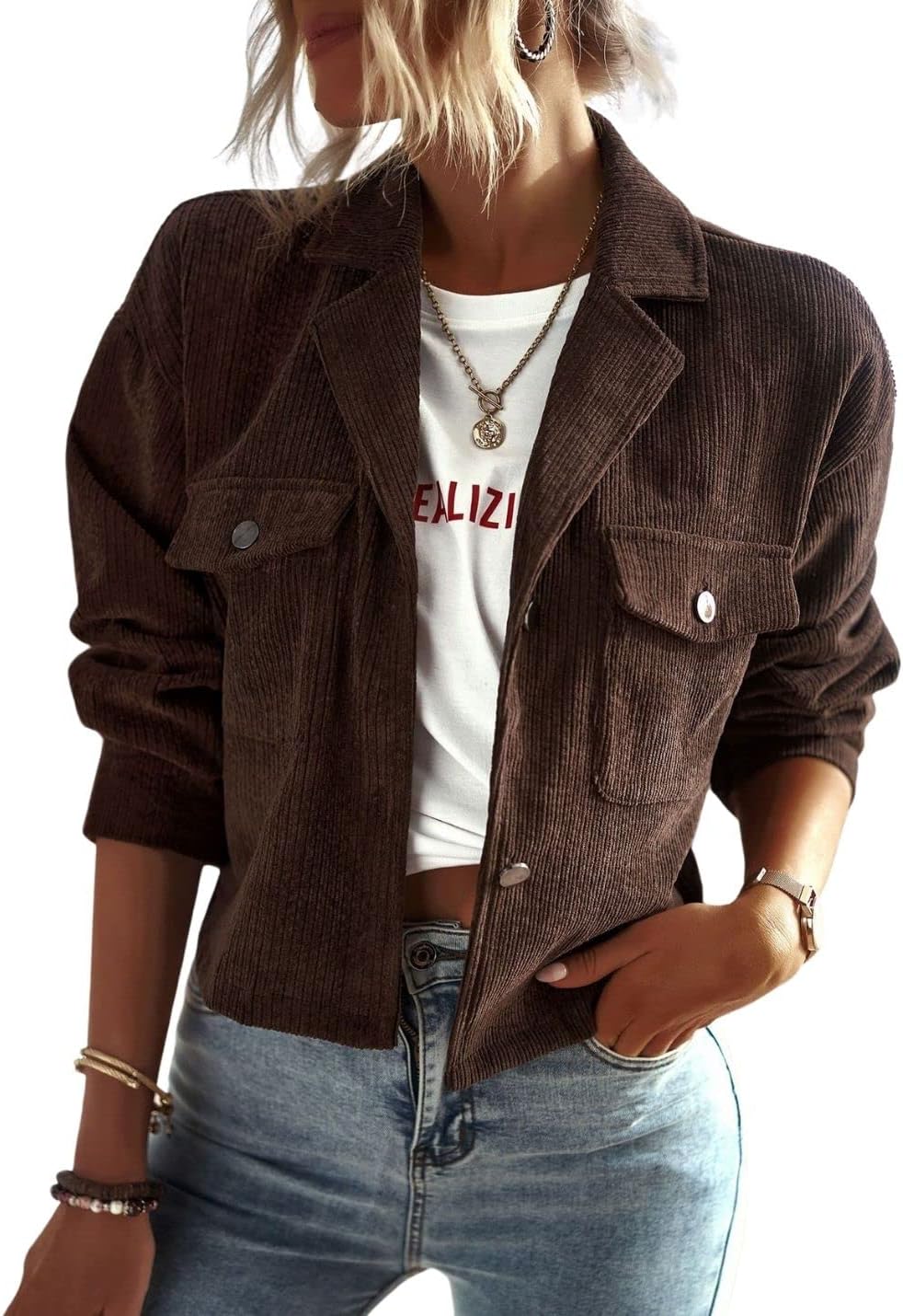 Kwoki Women's Corduroy Jackets Casual Button Down Cropped Shacket Fashion Trendy Crop Top Blazers
