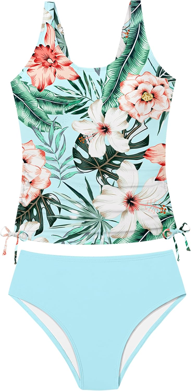 Qaoerde Girls Swimsuit Two Piece Girls Tankini Swimsuit Drawstring Printed Bathing Suit Ruched Swimwear Set 9-16 Years