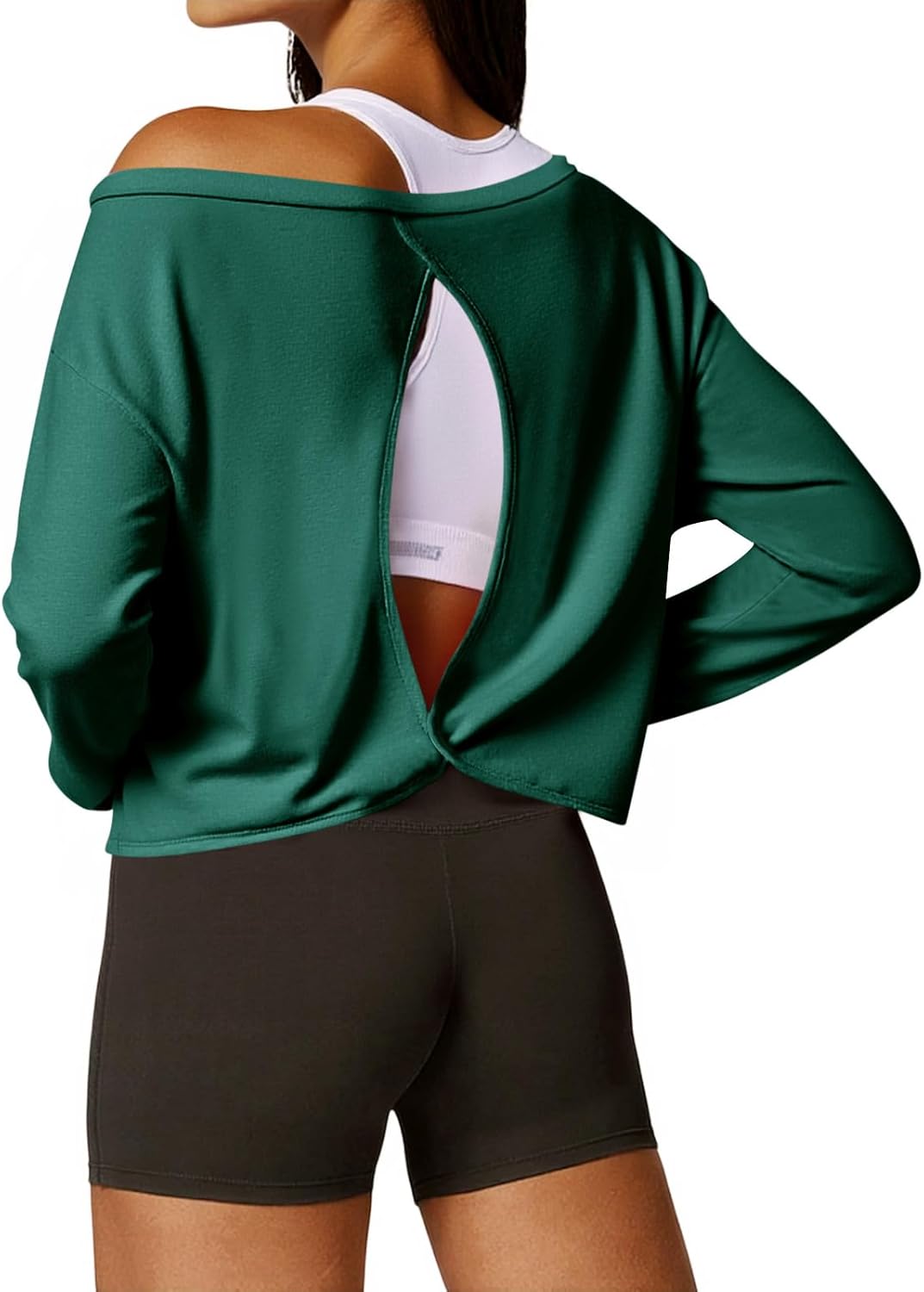 Yousify Womens Open Back Workout Tops Cropped Long Sleeve Boat Neck Athletic Shirts Casual Running Gym Yoga Tees