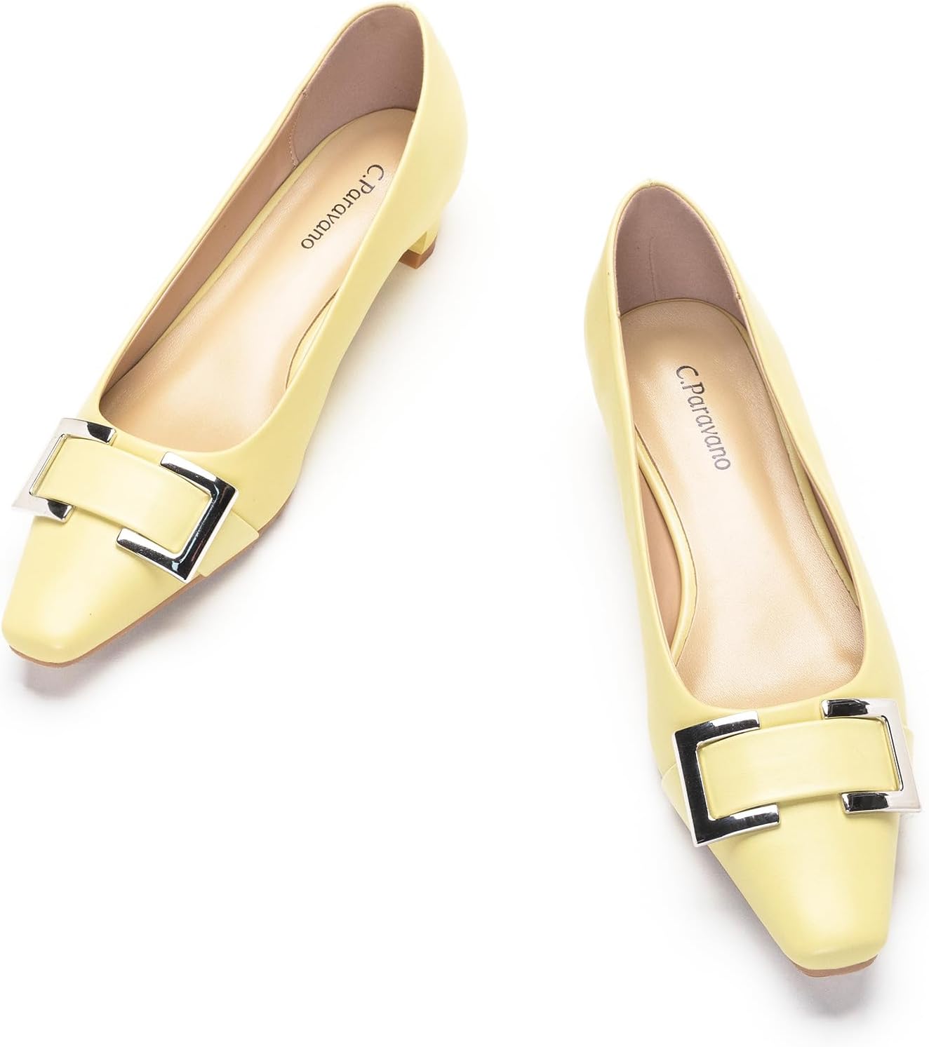 C.Paravano Metal Buckle Square Toe Low Block Heels Closed Toe Chunky Heels 1.1 in Low Heel Pumps Vintage Women's Pump for Party Wear Dress Pumps Shoes Soft Lambskin(Yellow,7.5)