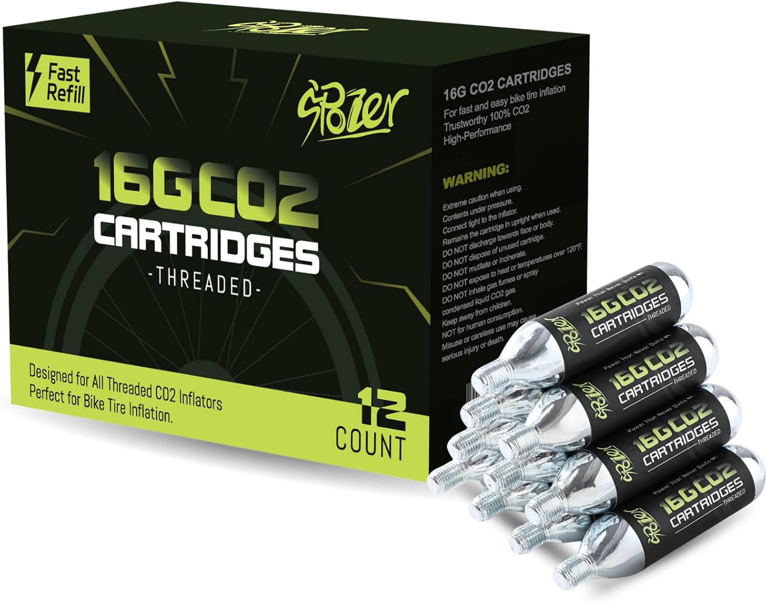 - [Fast & Effortless Tire Inflation]: SPOZER 16g threaded CO2 cartridges provide rapid, high-pressure inflation—fill a road bike tire up to 130 PSI or a mountain bike tire to 42 PSI in seconds. Perfect for quick roadside repairs or race emergencies.
