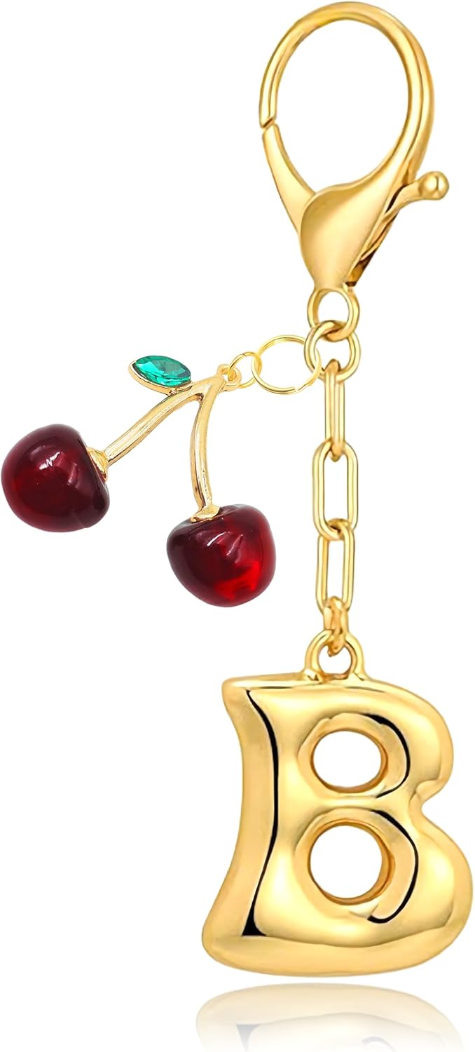 Bubble Initial Keychain with Cherry - Gold Letter Bag Charms for Women, Cute Purse Handbag Accessories Gift