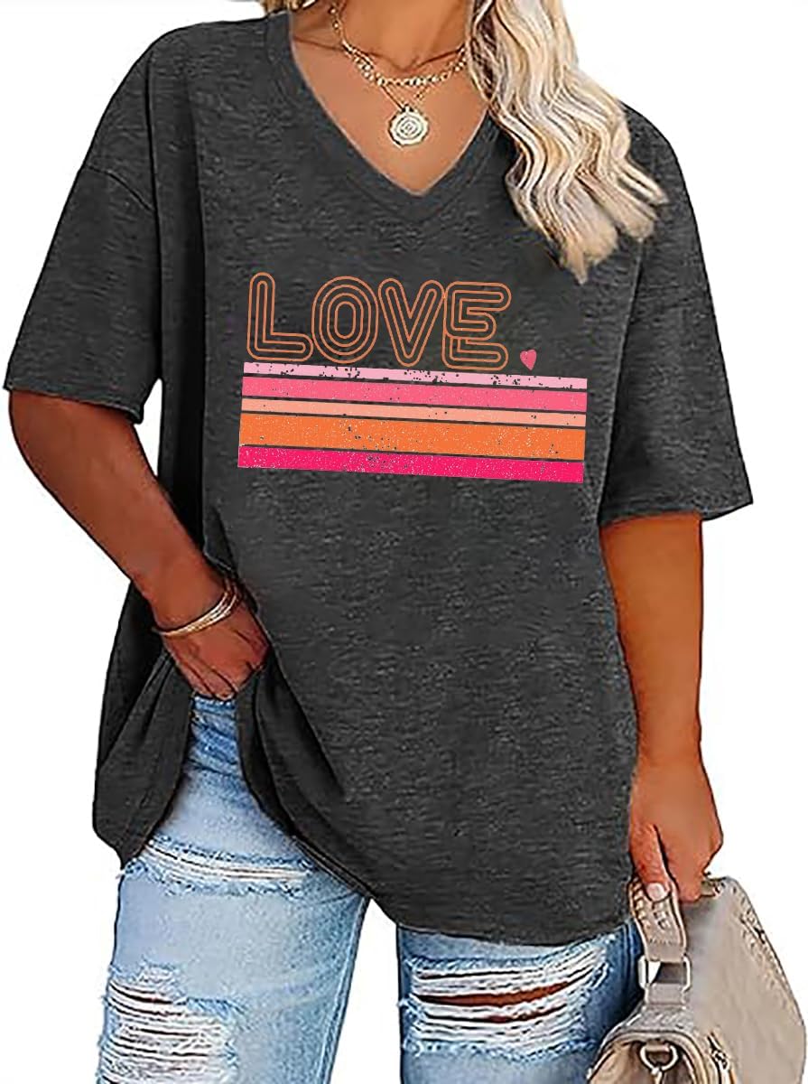 QIANRUO Plus Size Valentine's Day Shirt Women Retro Lover Heart Graphic Tees Casual Short Sleeve V-Neck Tops Blouse