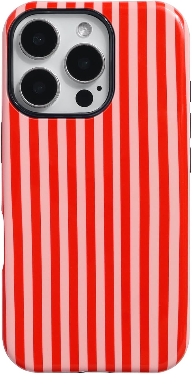 Fycyko Compatible with iPhone 16 Pro Case Striped Cute Aesthetic Phone Case Shockproof TPU Hard PC Protective Cover for iPhone 16 Pro-Pink Red