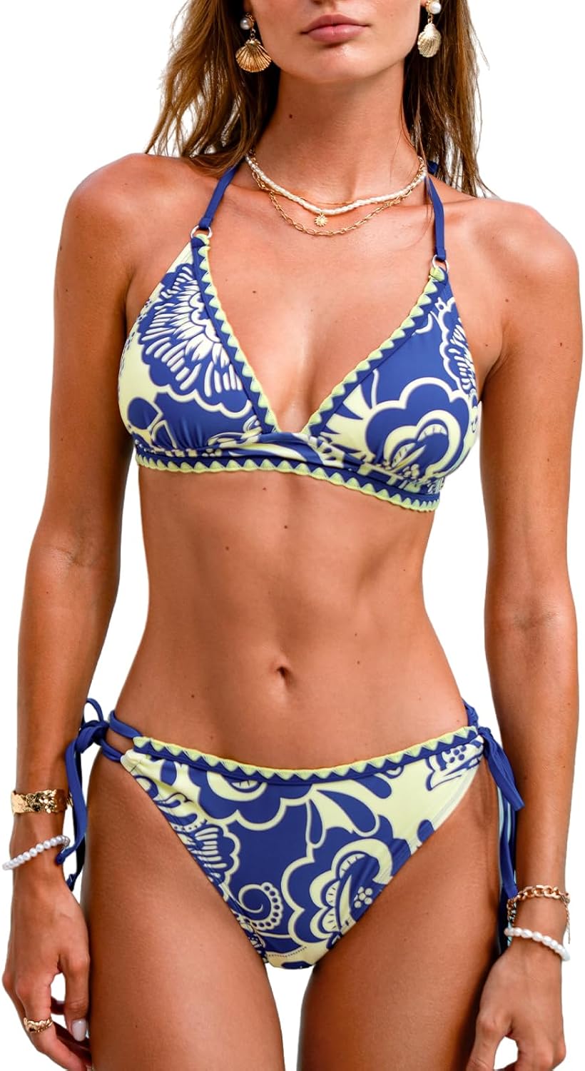 CUPSHE Women's Bikini Sets Two Piece Swimsuit V Neck Halter Back Self Tie Stitching Side Lace Up