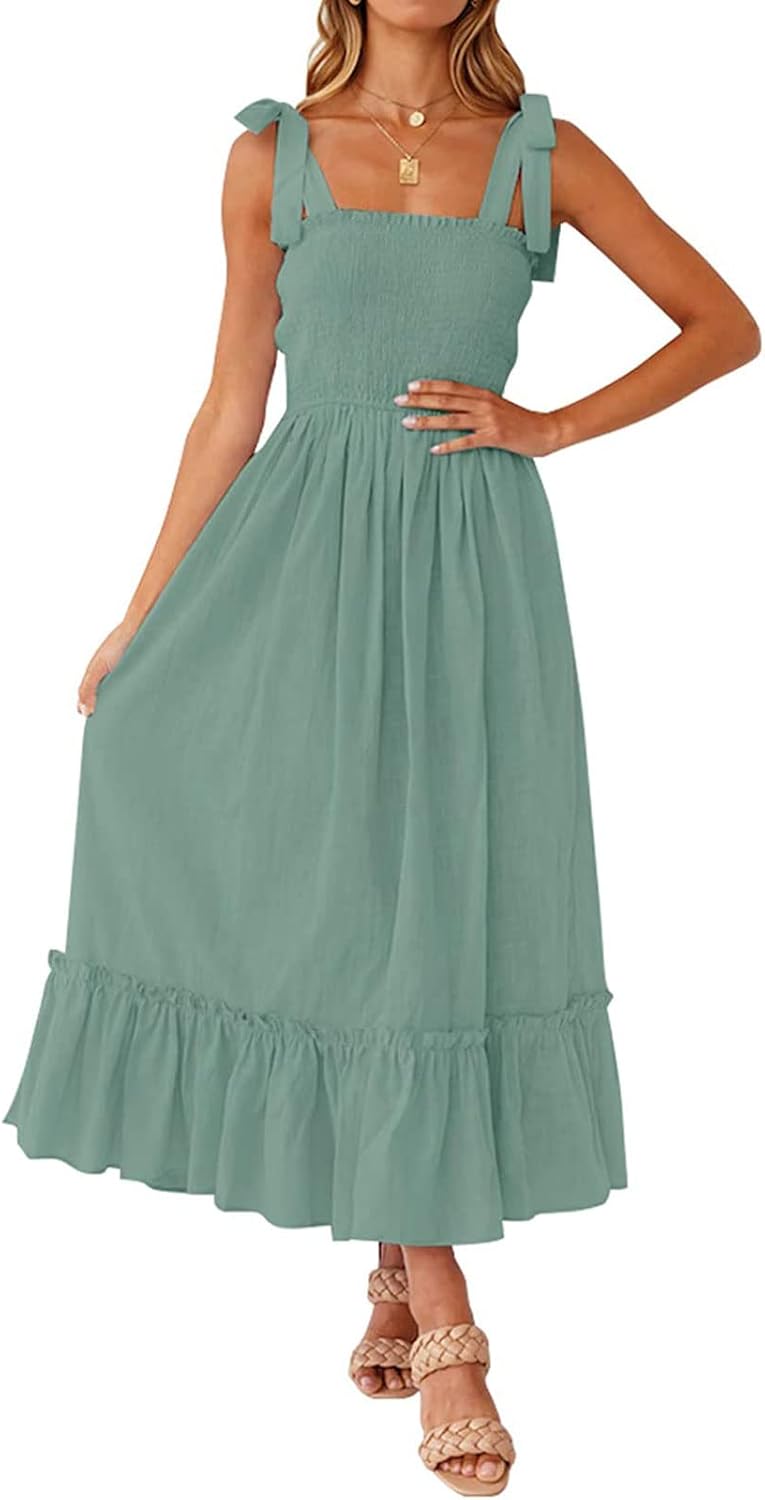 Tobrief Women's Boho Dress Summer Spaghetti Strap Square Neck Flowy Ruffle Beach Long Maxi Dress