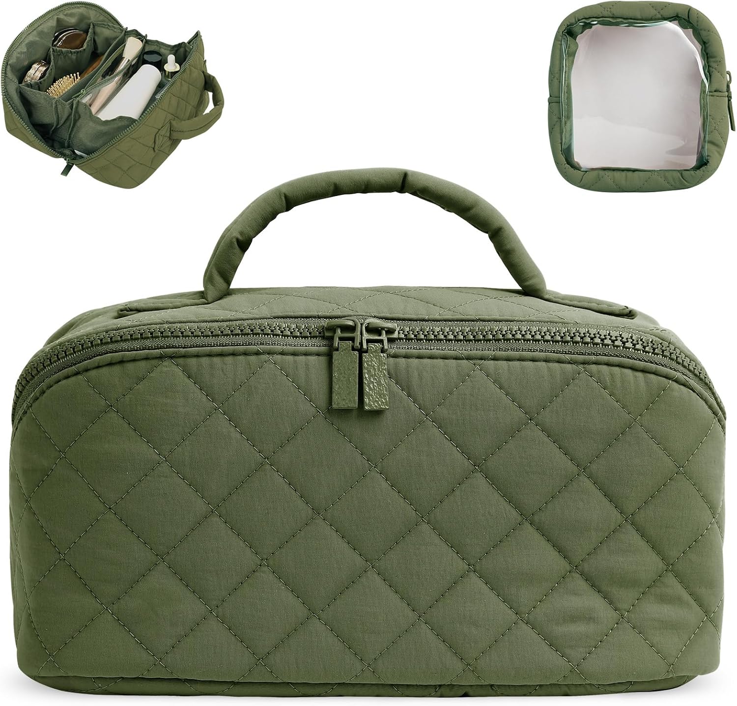 Travel Makeup Bag for Women, Puffer Quilted Open Flat Makeup Organizer with Toiletry Bag, Portable Cosmetic Case for Travel & Daily Use, Green