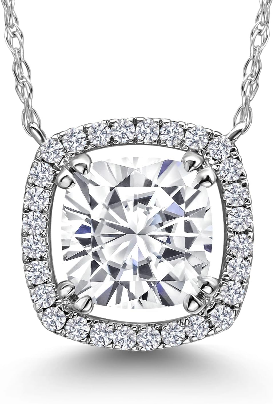 Gem Stone King 10K White Gold Moissanite and White Lab Grown Diamond Pendant Necklace For Women | 1.21 Cttw | Gemstone Birthstone | Cushion 6MM | With 18 Inch Chain