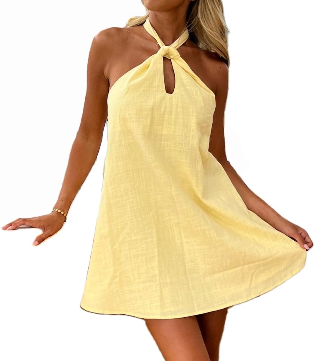 Women Y2K Halter Mini Dress Summer Boho Floral Print A-line Sleeveless Backless Beach Vacation Dress Party Clubwear