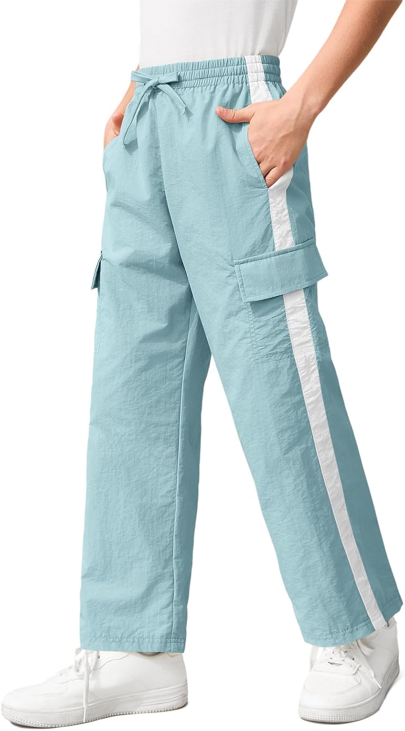 Haloumoning Boys Wide Leg Cargo Pants Kids Striped Elastic Waist Parachute Trousers with Pockets 5-14 Years