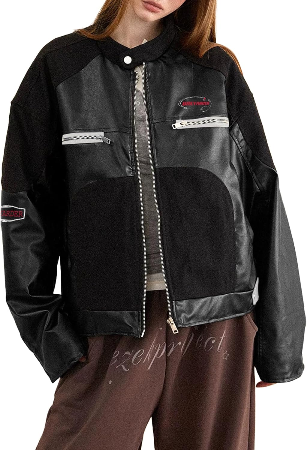 Bakyarder Women’s Faux Leather Moto Jacket Denim Patchwork Zip Up Streetwear Coats