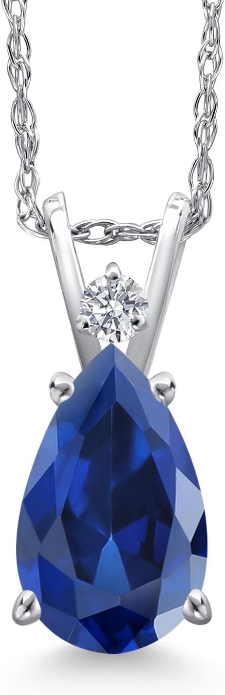 Gem Stone King 14K White Gold Blue Created Sapphire and Lab Grown Diamond Pendant Necklace for Women | 2.14 Cttw | Gemstone September Birthstone | Pear Shape 10X7MM | With 18 Inch Chain