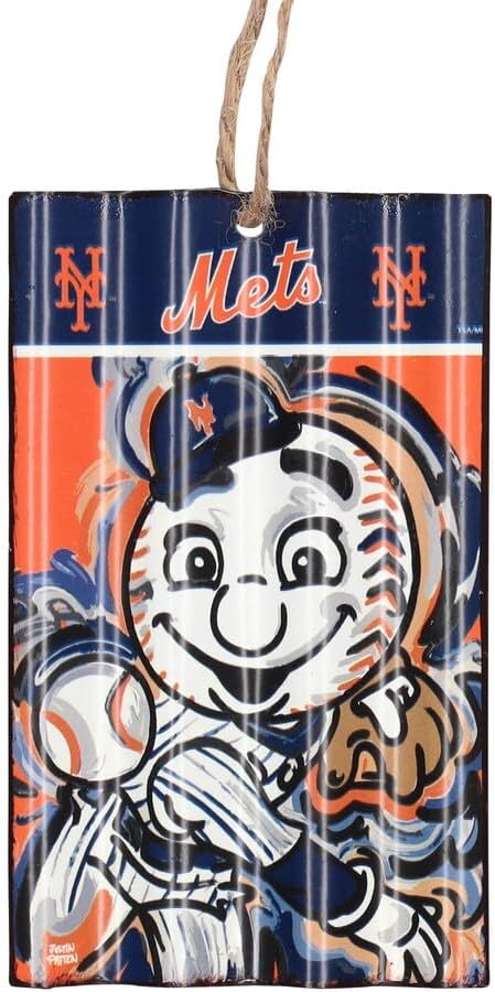 - New York Mets corrugated metal sign ornament featuring artwork inspired by the work of painter Justin Patten