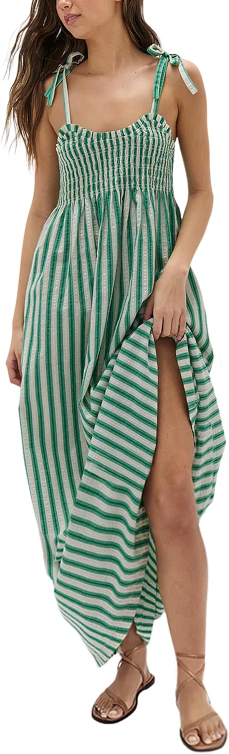 Lentta Women's Striped Smocked Maxi Dress Causal Spaghetti Strap Stretchy Flowy Swing Long Dress with Pockets