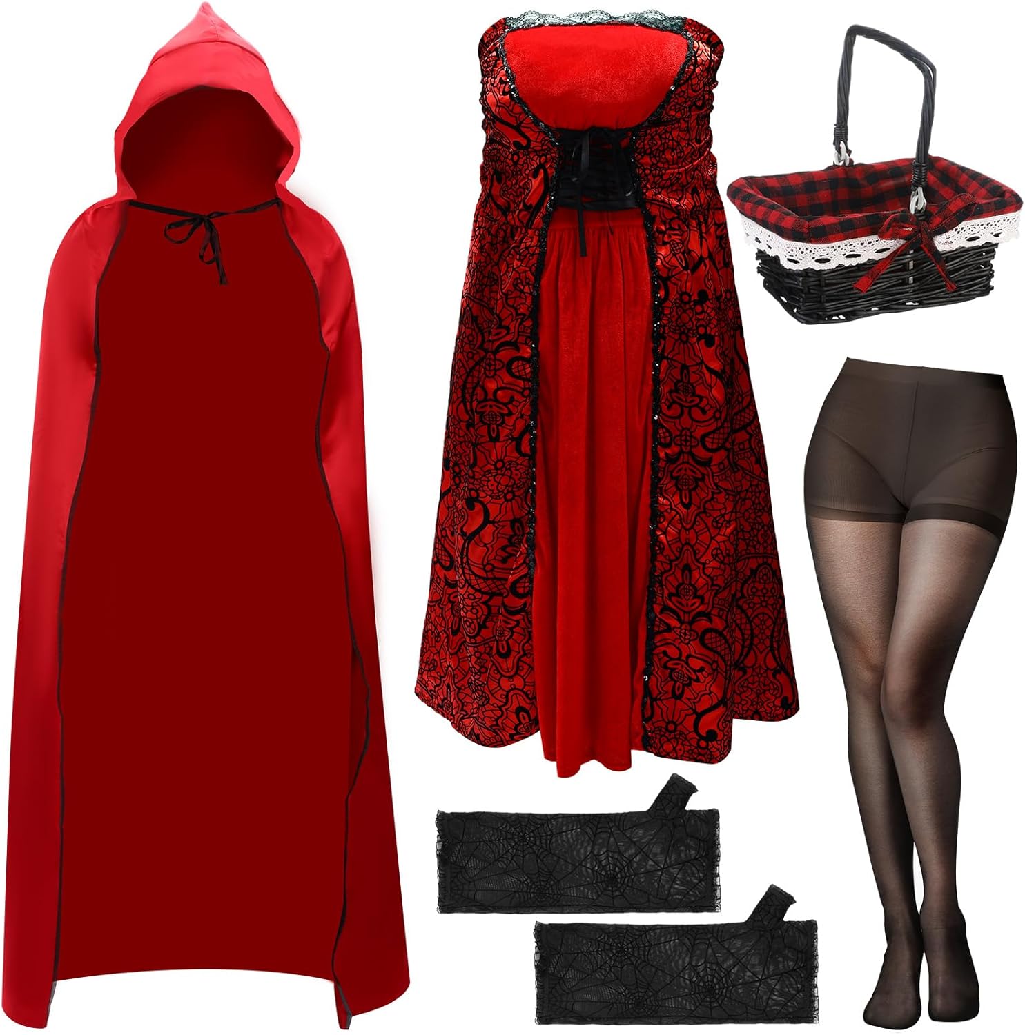 Mepase Plus Size Little Red Riding Hood Costume for Women Adult Halloween Hood Cloak Cape Red Dress Basket Tights Gloves for Cosplay Party Accessories