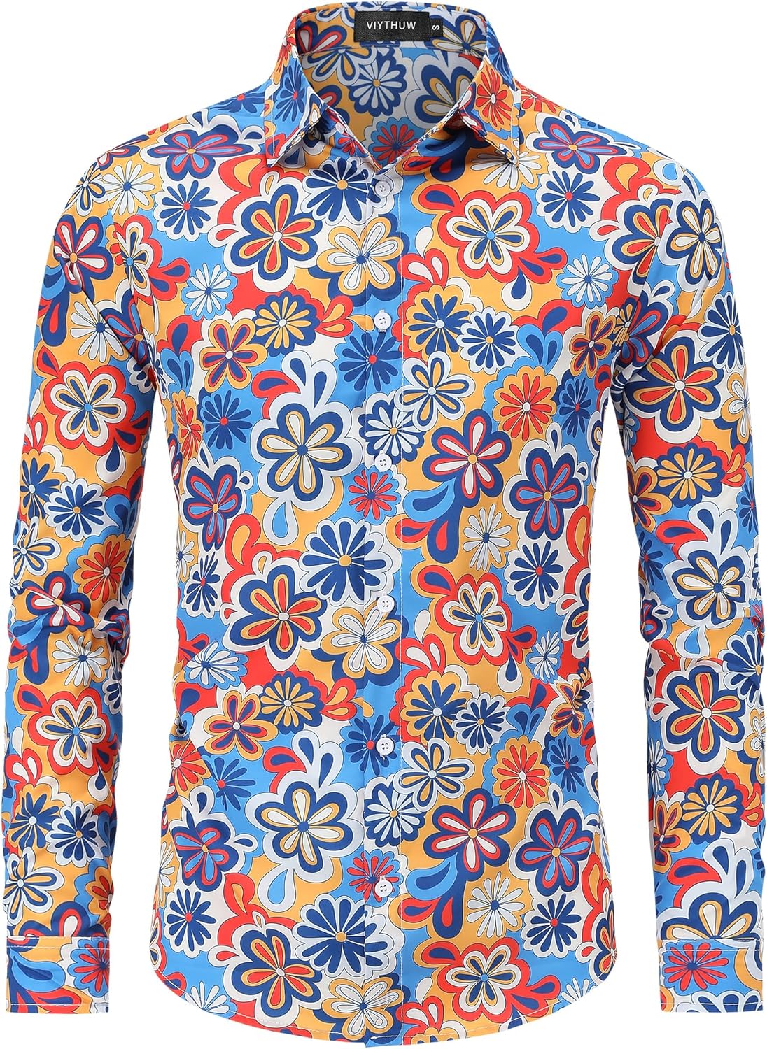 70s Outfits for Men Long Sleeve Casual Button Down 70s Disco Retro Paisley Shirt 70s Floral Vintage Hip Hop Shirts