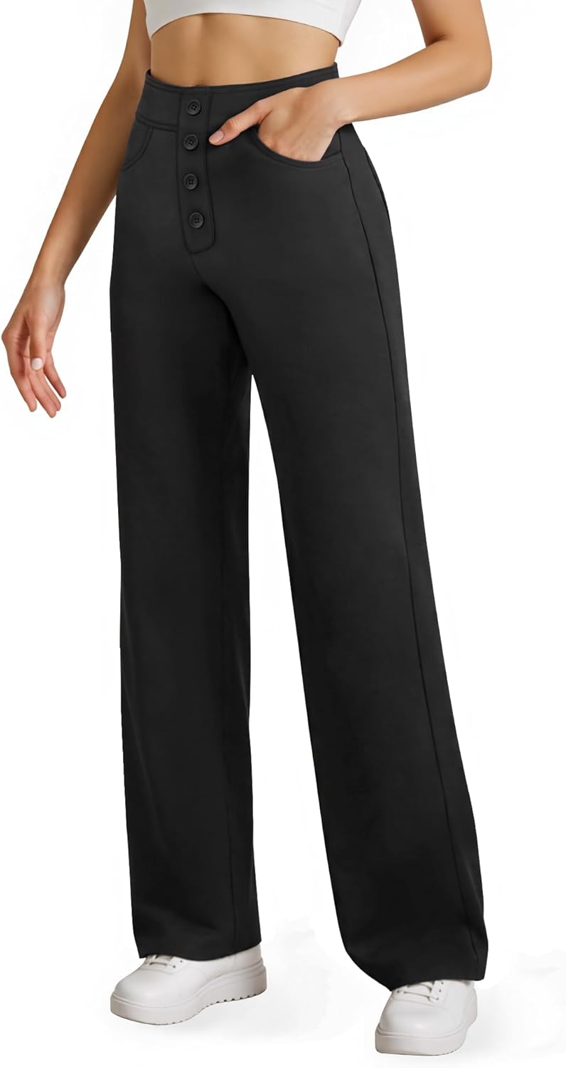 keriffe Womens Wide Leg Dress Casual Pants Pockets High Waist Button Stretchy Business Work Trousers Office Slacks