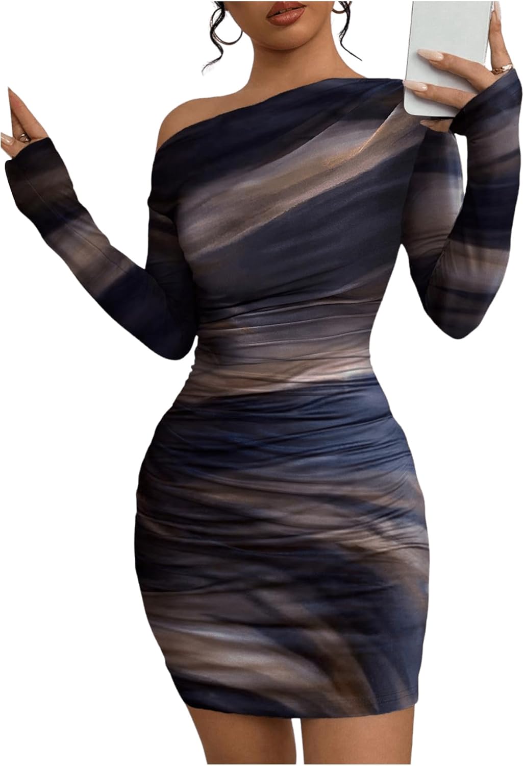 SOLY HUX Women's Sexy Off The Shoulder Bodycon Mini Dress Tie Dye Long Sleeve Ruched Asymmetrical Club Dresses