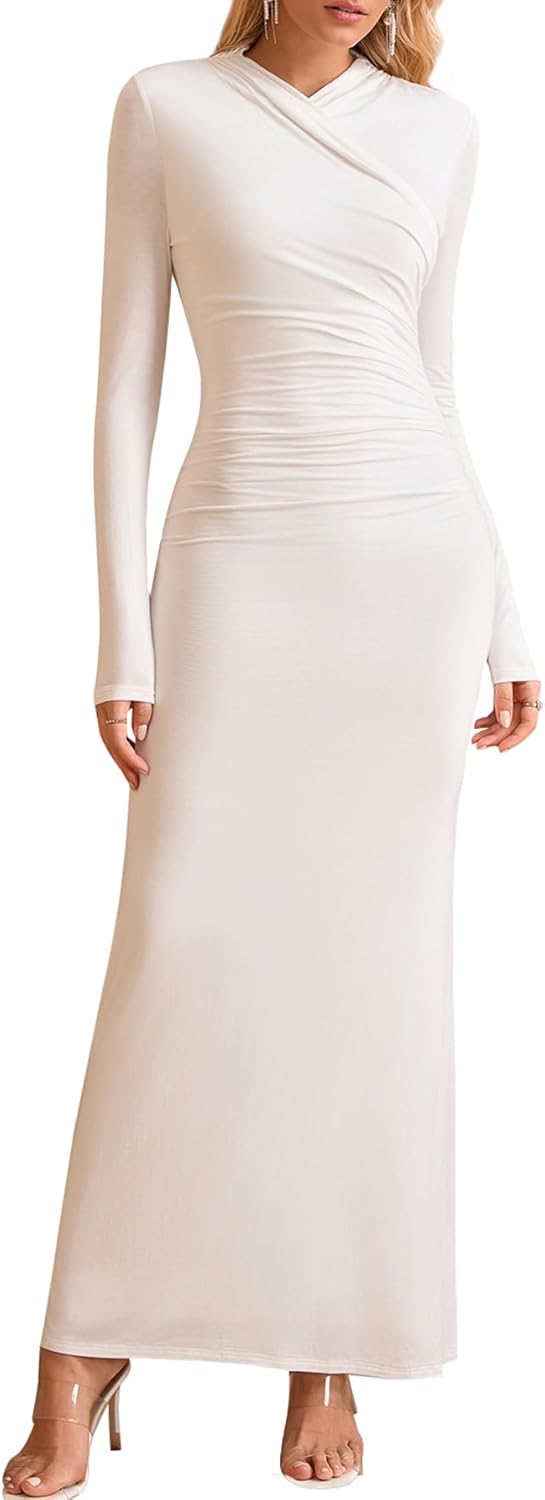 KUTUMAI Long Sleeve Formal Wedding Guest Dresses for Women Fall Modest V Neck Bodycon Maxi Cocktail Party Dress