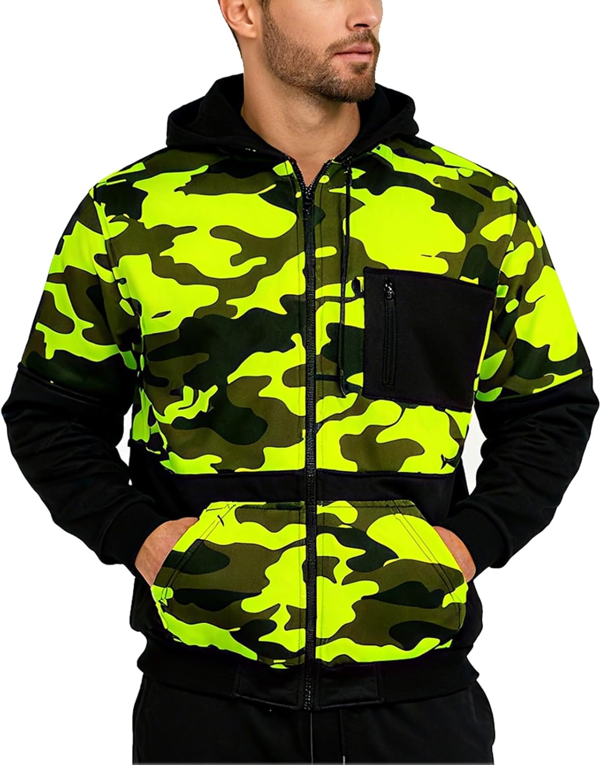 Men's Camo Fleece Hoodie Zipper Casual Military Sweatshirt with Pocket Hi Vis Construction Work Jakcet