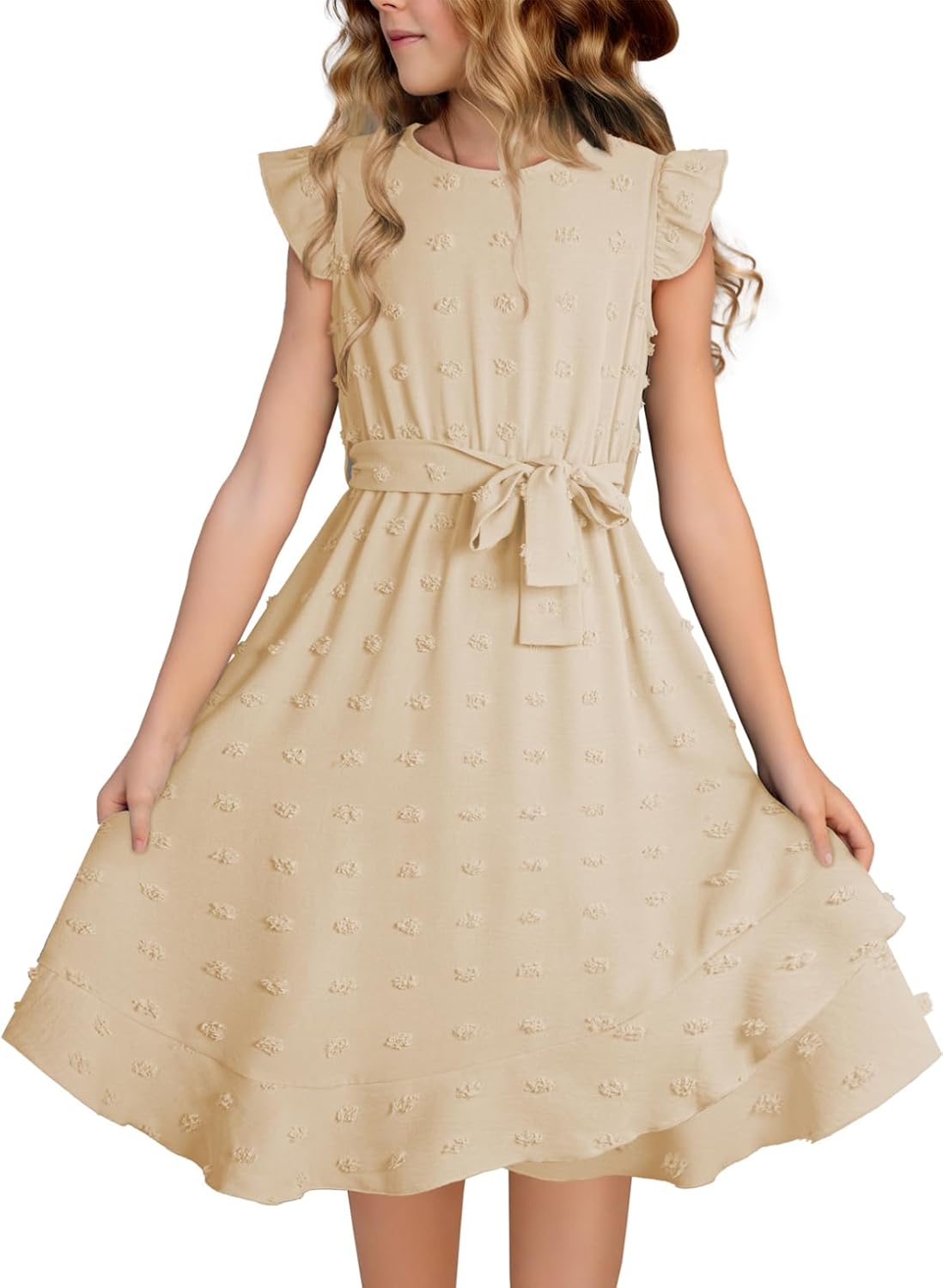blibean Tween Girls Short Sleeve Dresses Swiss Dot Belt Dress Size 6-15 Years