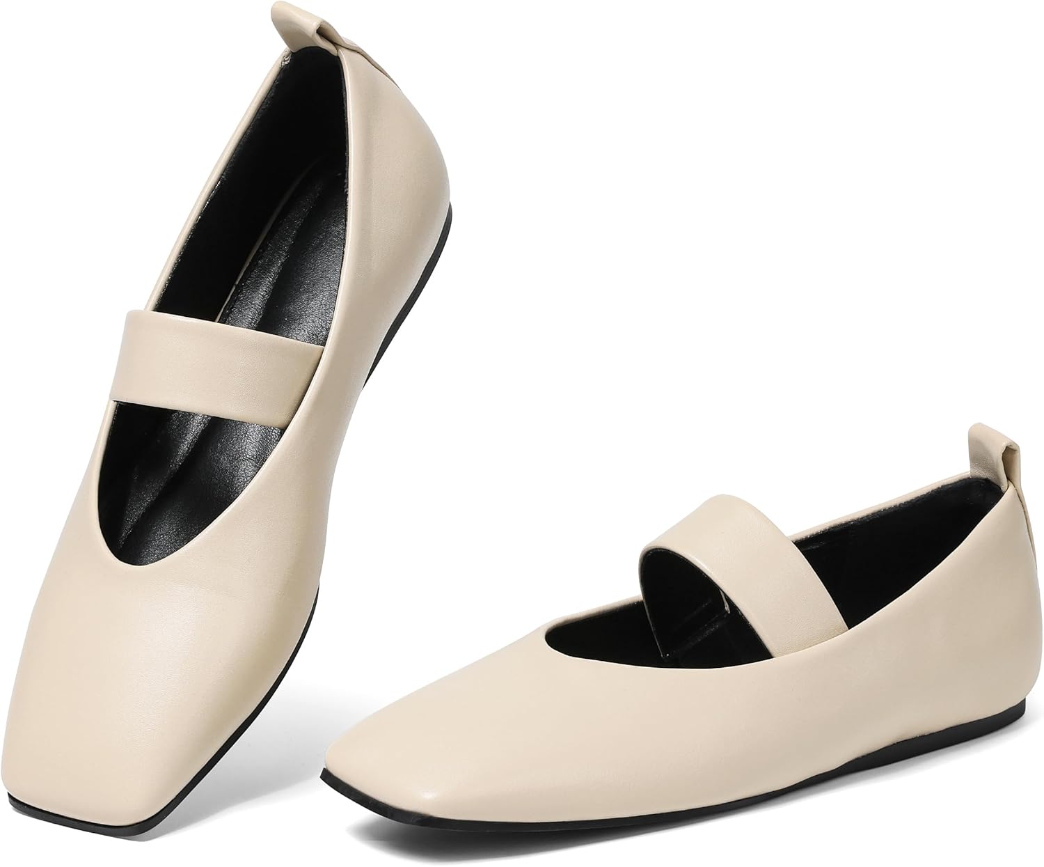 Uacllcau Ballet Flats Shoes for Women Square Toe Mary Jane Shoes Flat Women Comfortable Dressy Casual Slip On Ballerina Mesh Flats with Elastic Strap Beige