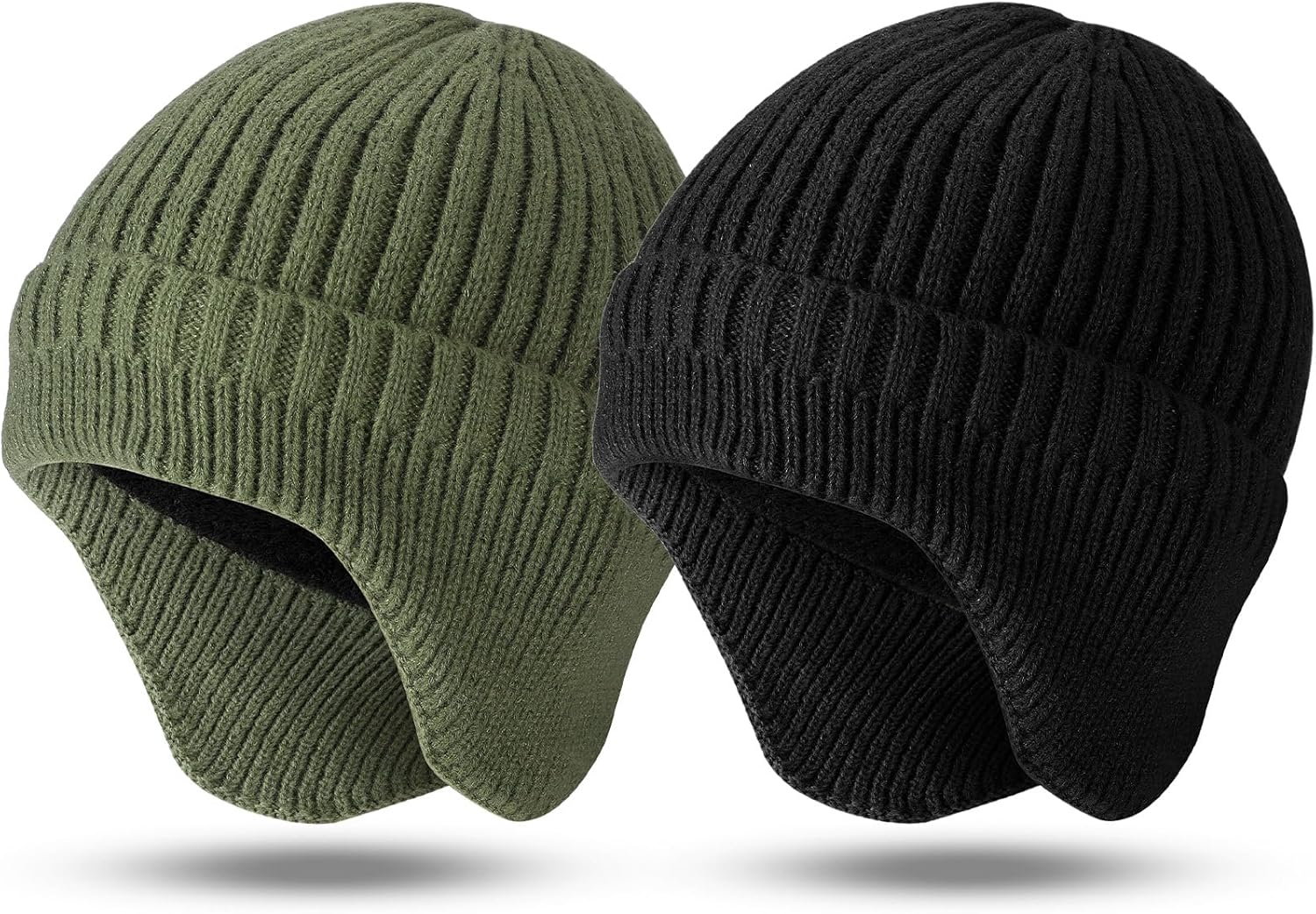 2 Pack Winter Knit Ear Flap Hat for Men Women - Thick Fleece Lined Warm Beanie with Ear Cover, Stretchy Skull Cap (Black & Army Green) for Cold Weather Outdoor Sports