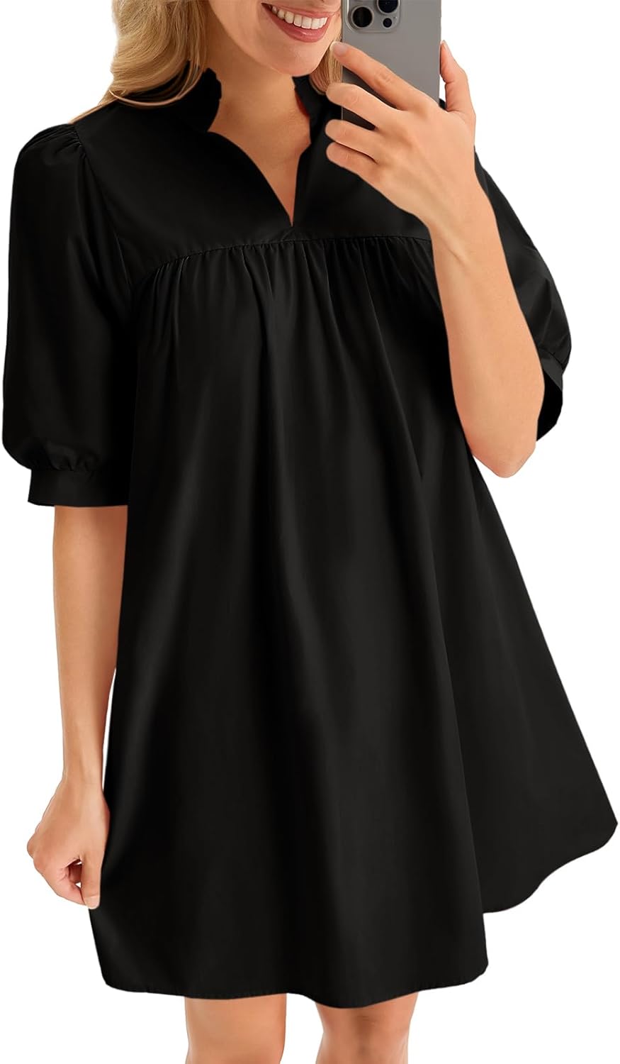 Cicy Bell Womens V Neck Babydoll Mini Dress Short Puff Sleeve Summer Casual Swing Dresses with Pockets