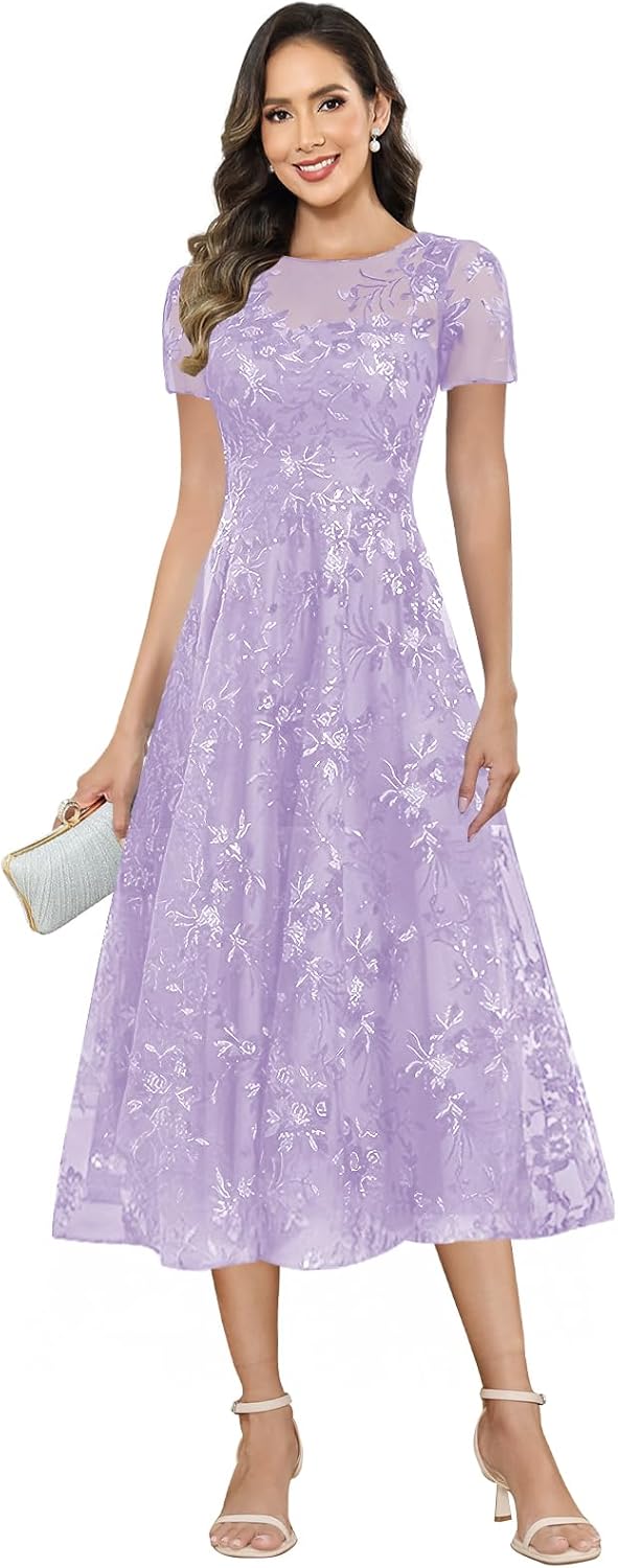 Lace Sequin Mother of The Bride Dresses with Sleeves Tea Length A-Line Chiffon Formal Evening Gown