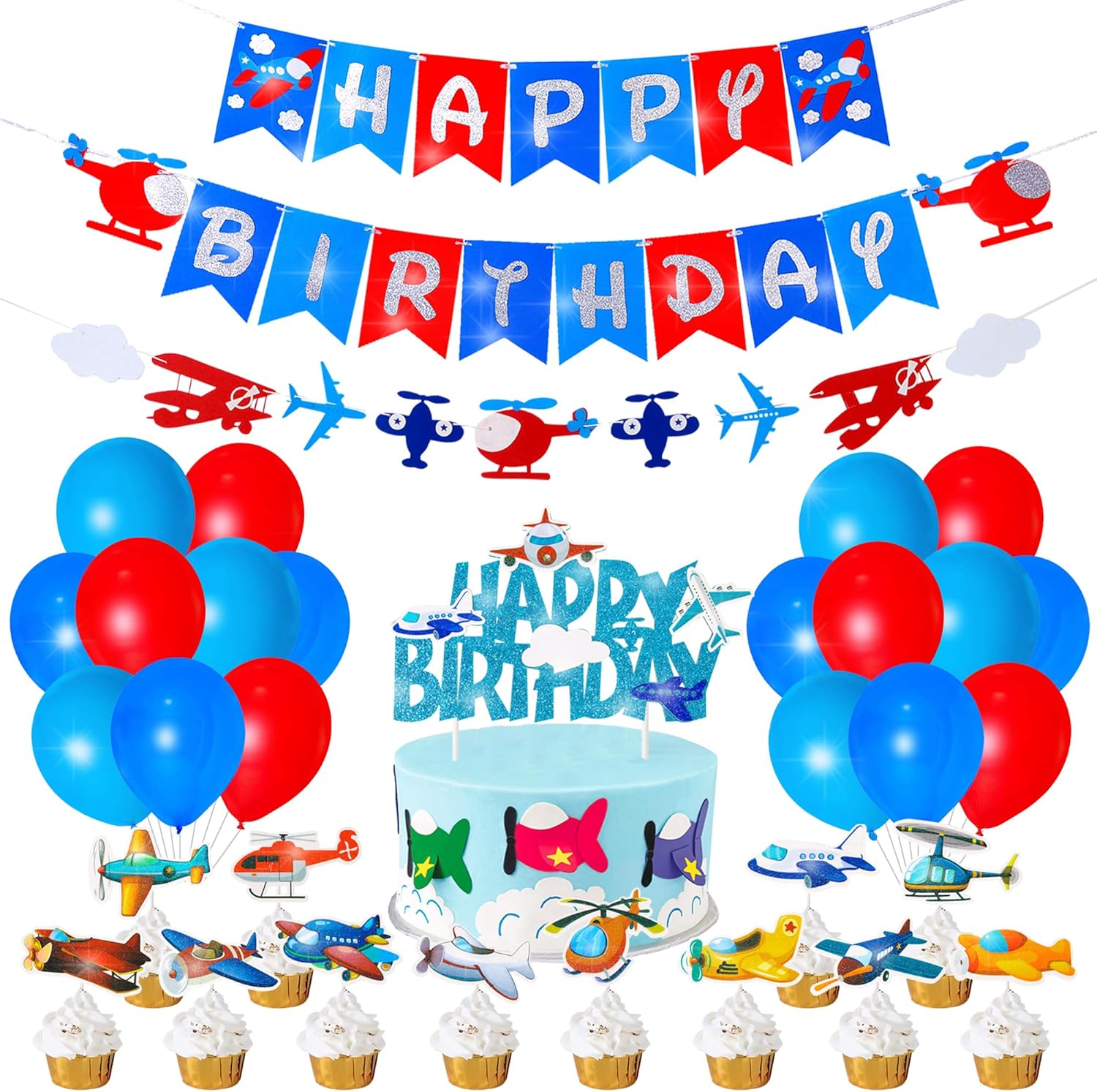 - ❤【Airplane plane aircraft theme party decoration】Package includes 1pcs happy birthday glitter felt banner; 1pcs plane and cloud garland, 3pcs airplane helium foil balloons; 12pcs blue and red latex balloons; 1pcs gltter birthday cake topper and 24pcs aircaft cupcake toppers. Perfect decoration set for your anniversary, birthday, holiday, celebration or any other airplane aircraft theme party!