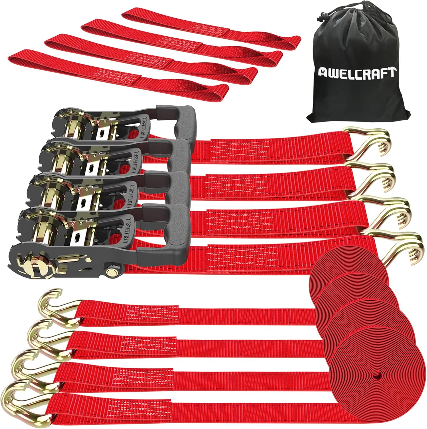 Ratchet Straps (4PK) - 4500lbs Breaking Strength 1.5''×15' Heavy Duty Tie Down Straps with Padded Handles, Double J Hooks & Soft Loops for Moving Motorcycle, Trailer & Trucks (Red)