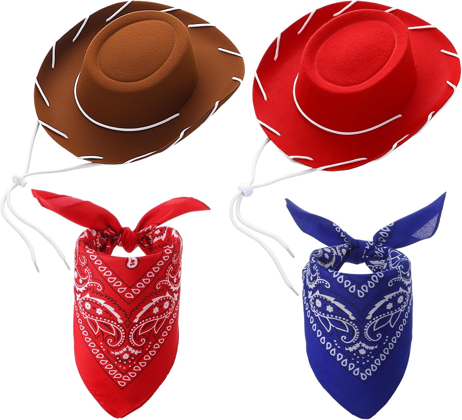 4 Pcs Child Western Cowboy Hats and Bandanas, Red and Brown Cowgirl Hats for Toddlers & Kids 3-6 for Halloween Costume
