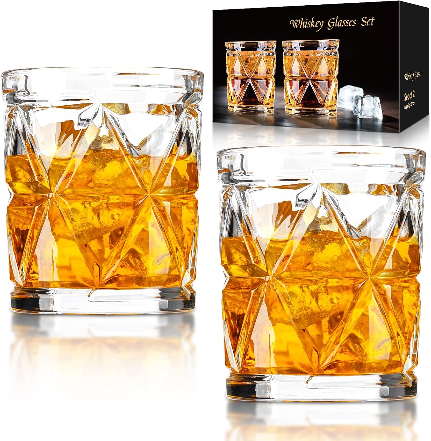 9.5OZ Whiskey Glasses Set of 2,Old Fashioned Glass for Scotch, Bourbon, Rum, Liquors and Cocktail Drinks Unique Whiskey Glasses Gift for Men and Dad, Christmas