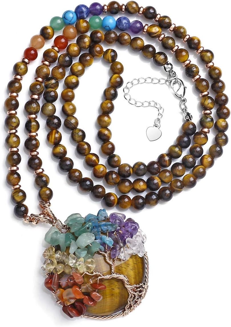 Jovivi 7 Chakra Gemstone Reki Healing Crystal Necklace Round Circle Shape Ammonite Fossil Resin Chip Stones Pendant Necklace for Women Men Life Tree Jewelry Christmas Gifts
