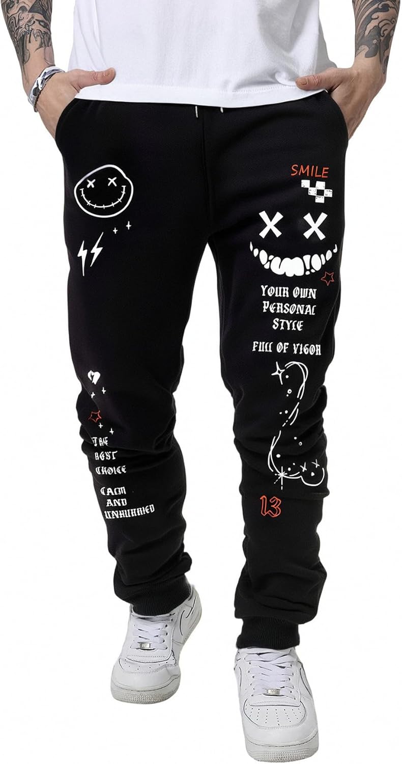 WDIRARA Men's Graphic Print Knot Front Sweatpants Drawstring Elastic Waist Trousers with Pockets