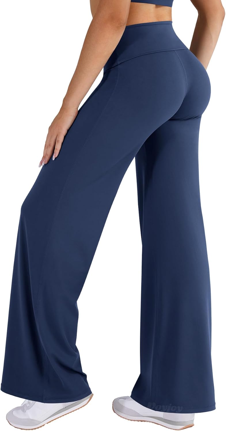 VOYJOY Fold Over Straight Leggings Womens Wide Leg Yoga Pants No Front Seam 31.5" Mid Low Waist Stretch Sweatpants