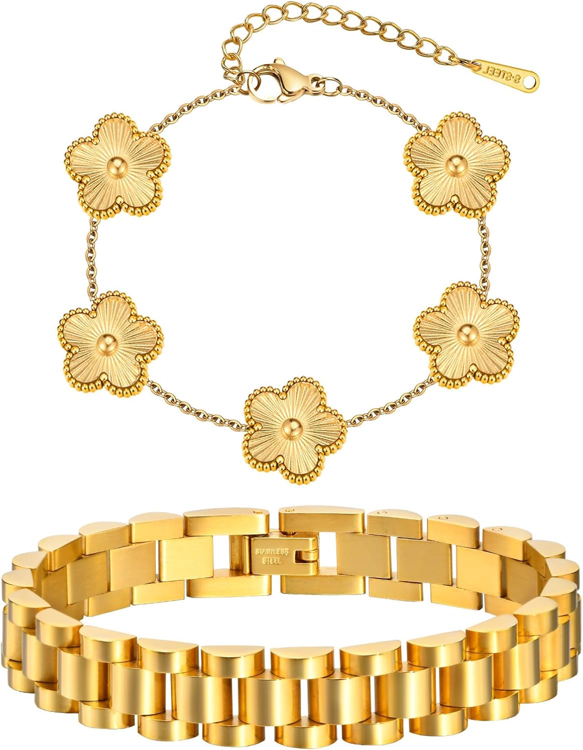 Stackable Gold Floral Bracelets Set , 2pcs 18K Gold Plated Bracelet Non-tarnish,Stainless Steel Link Chain Friendship Bracelet,Watch Band Trendy Jewelry,Christmas Valentines Birthday Gifts for Women