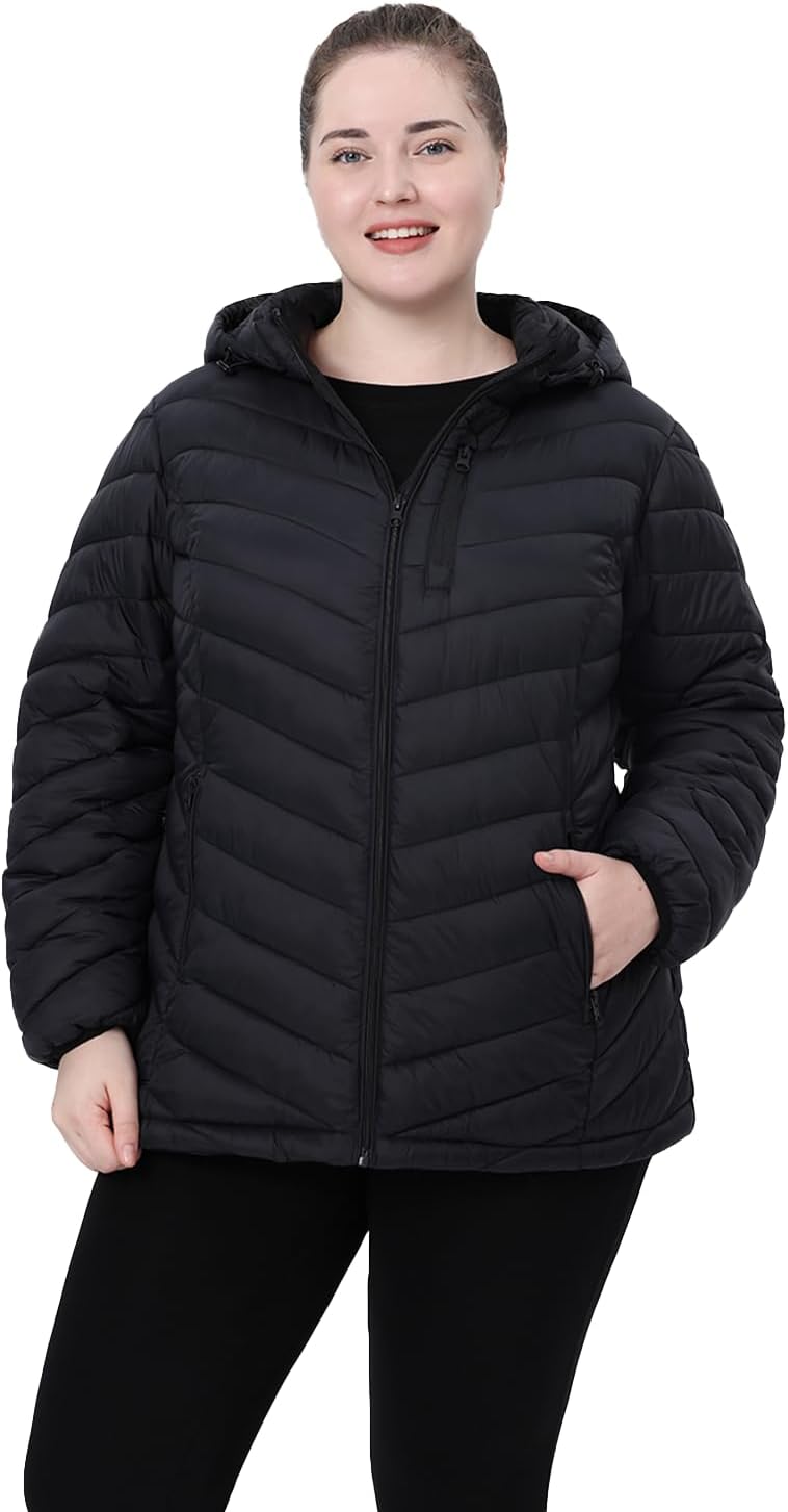 Plus Size Women Packable Puffer Jacket 1X-6X Water-Resistant Lightweight Coat Detachable Hood(Exclusively Plus Size)