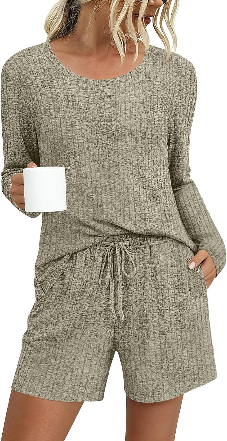 DouBCQ Womens Pajama Sets Ribbed Knit Lounge Set Long Sleeve Top and Shorts 2 Piece Casual Pjs with Pockets
