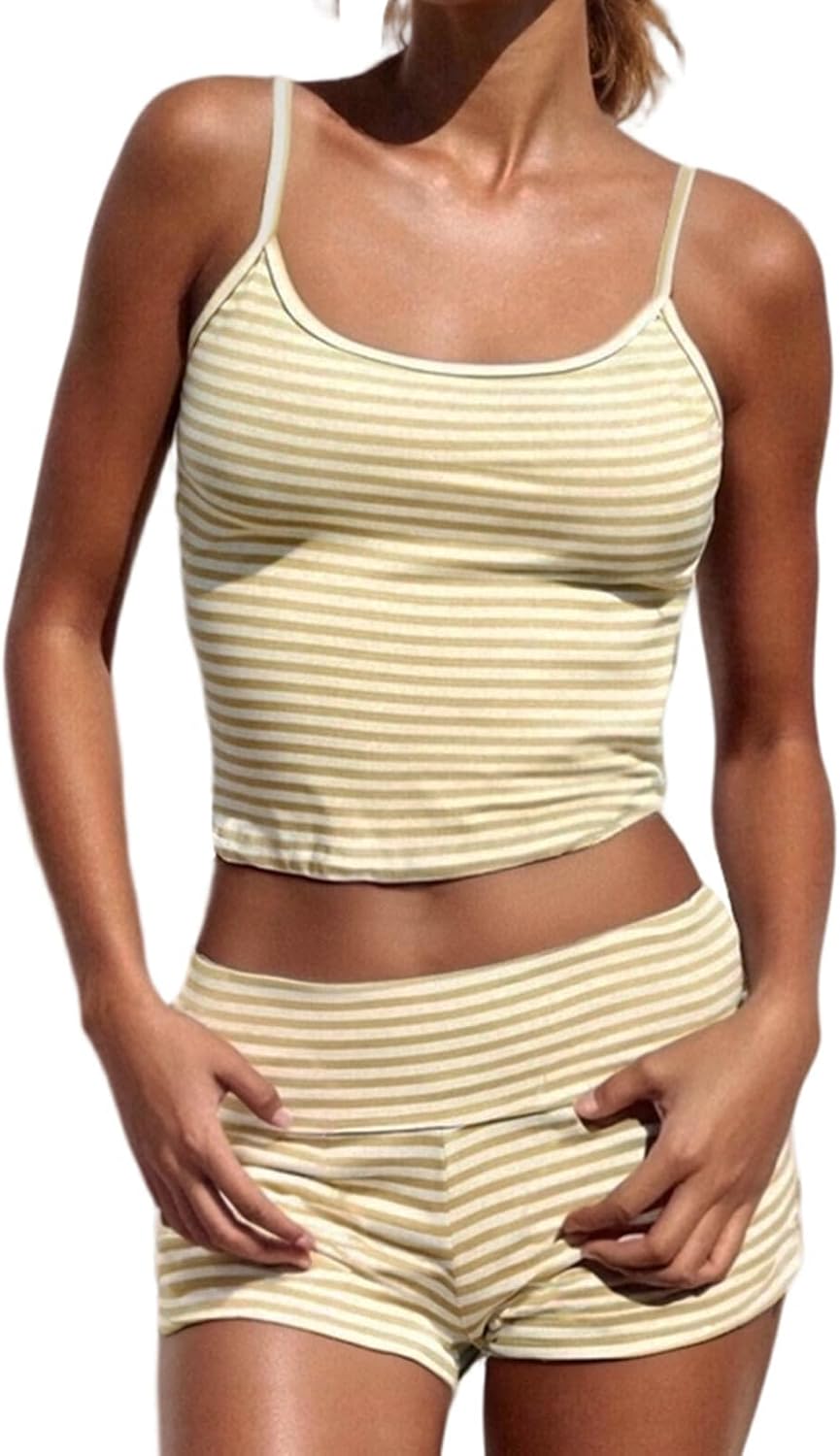 DSORVICD Women Y2K Striped Pajama Set Sleeveless Slim Crop Cami Tank Fold Over Shorts Teen Girls Cute PJ Sets