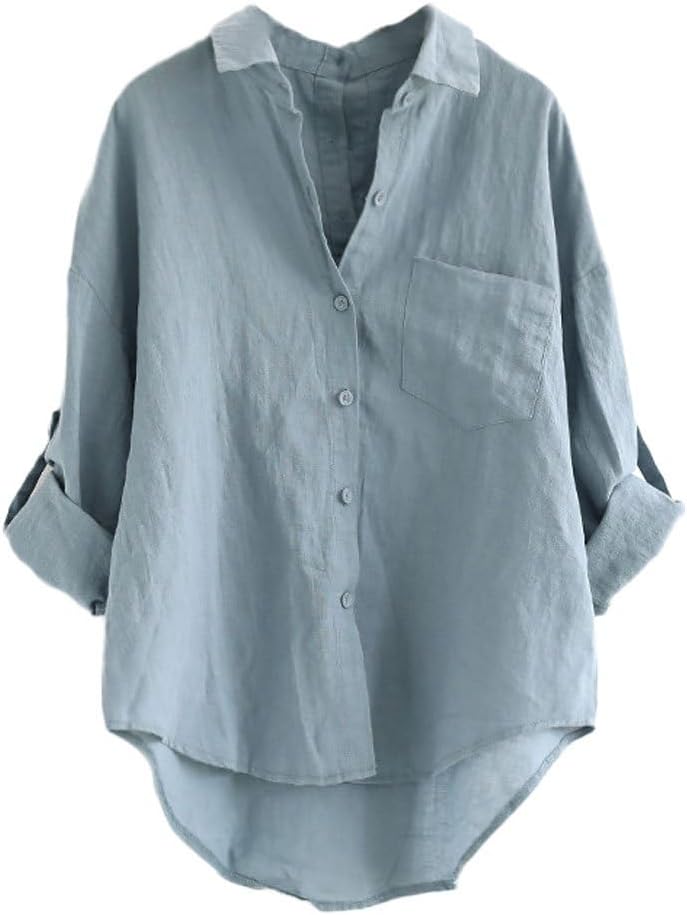 Minibee Women's Linen Blouse High Low Shirt Roll-Up Sleeve Tops