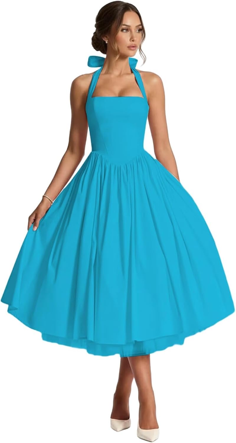 Women Summer Halter Dress Low Cut Sleeveless A Line Tulle Swing Flowy Tea Length Dress Corset Prom Formal Ball Gowns