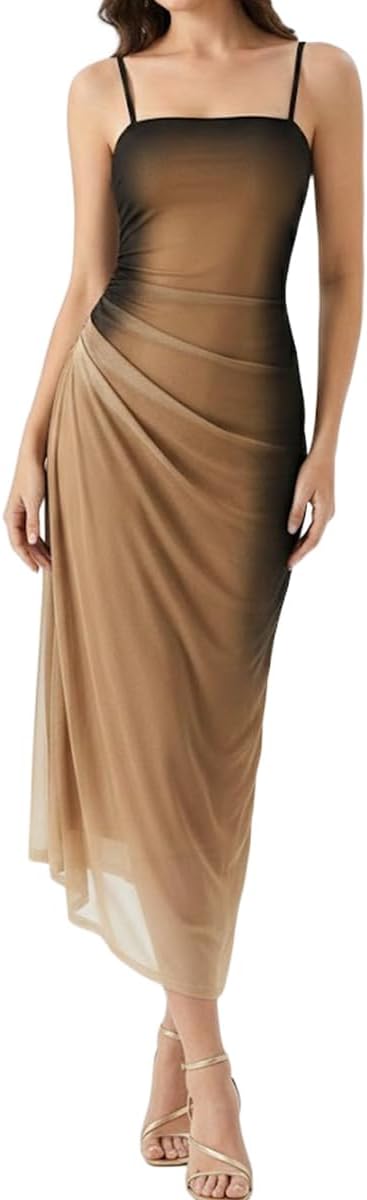SKAYS Women's Summer Sleeveless Pleated Mesh Spaghetti Strap Party Bodycon Elegant Long Wedding Guest Dress