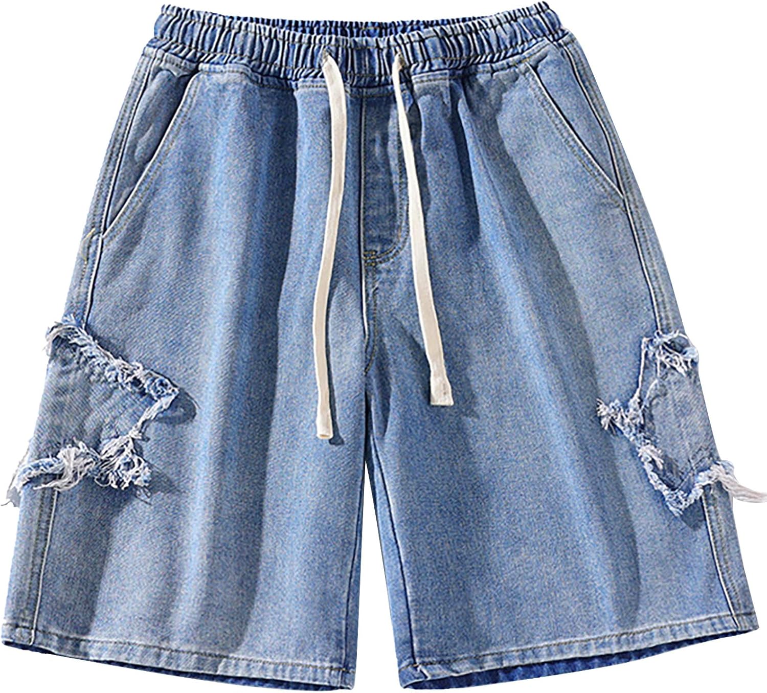 Womens Y2k Baggy Jorts-Drawstring Star Patchwork Wide Leg Jean Shorts with Pockets