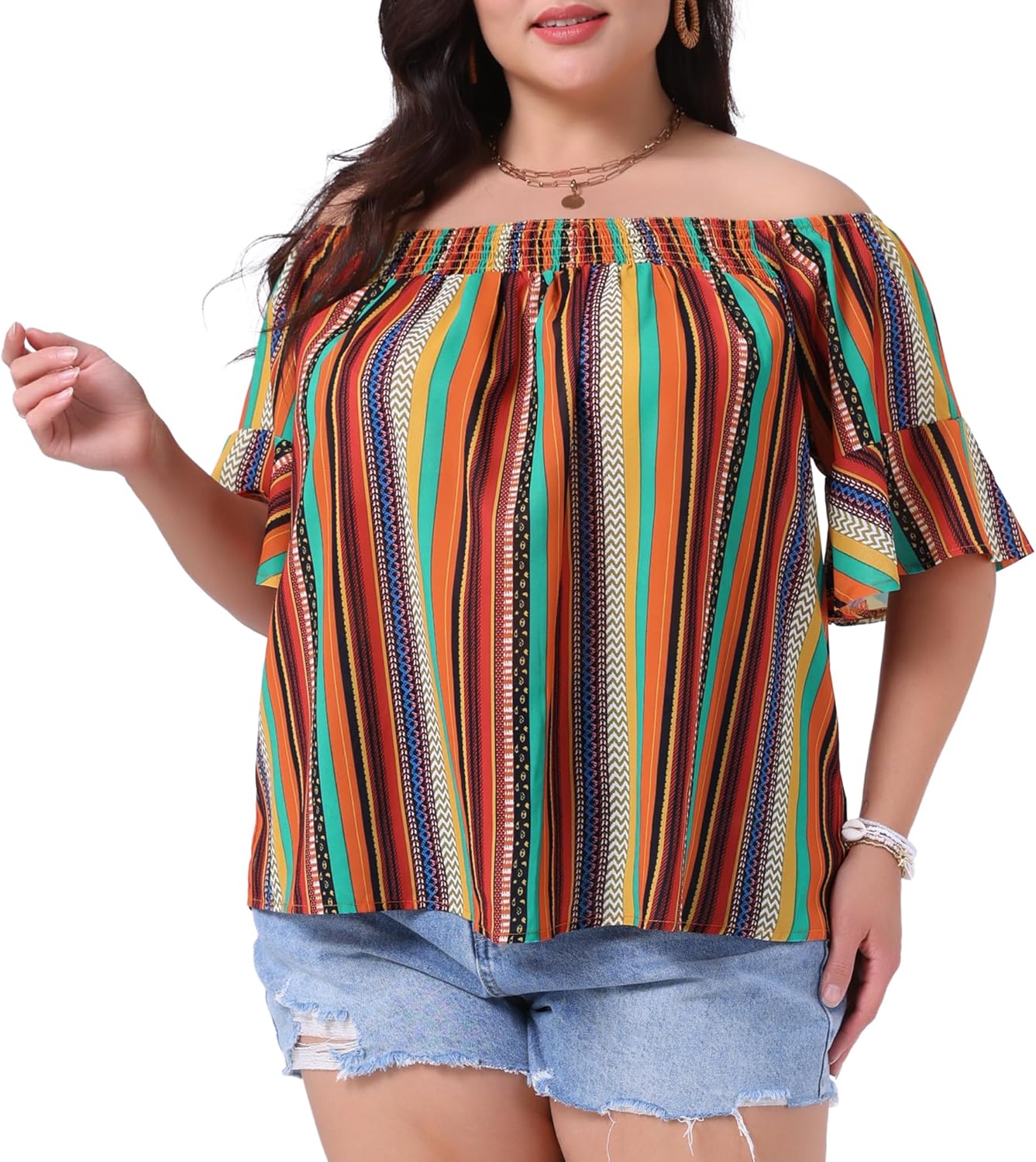 Agnes Orinda Plus Size Top for Women Boho Off Shoulder Short Sleeve Striped Blouse Shirt Top