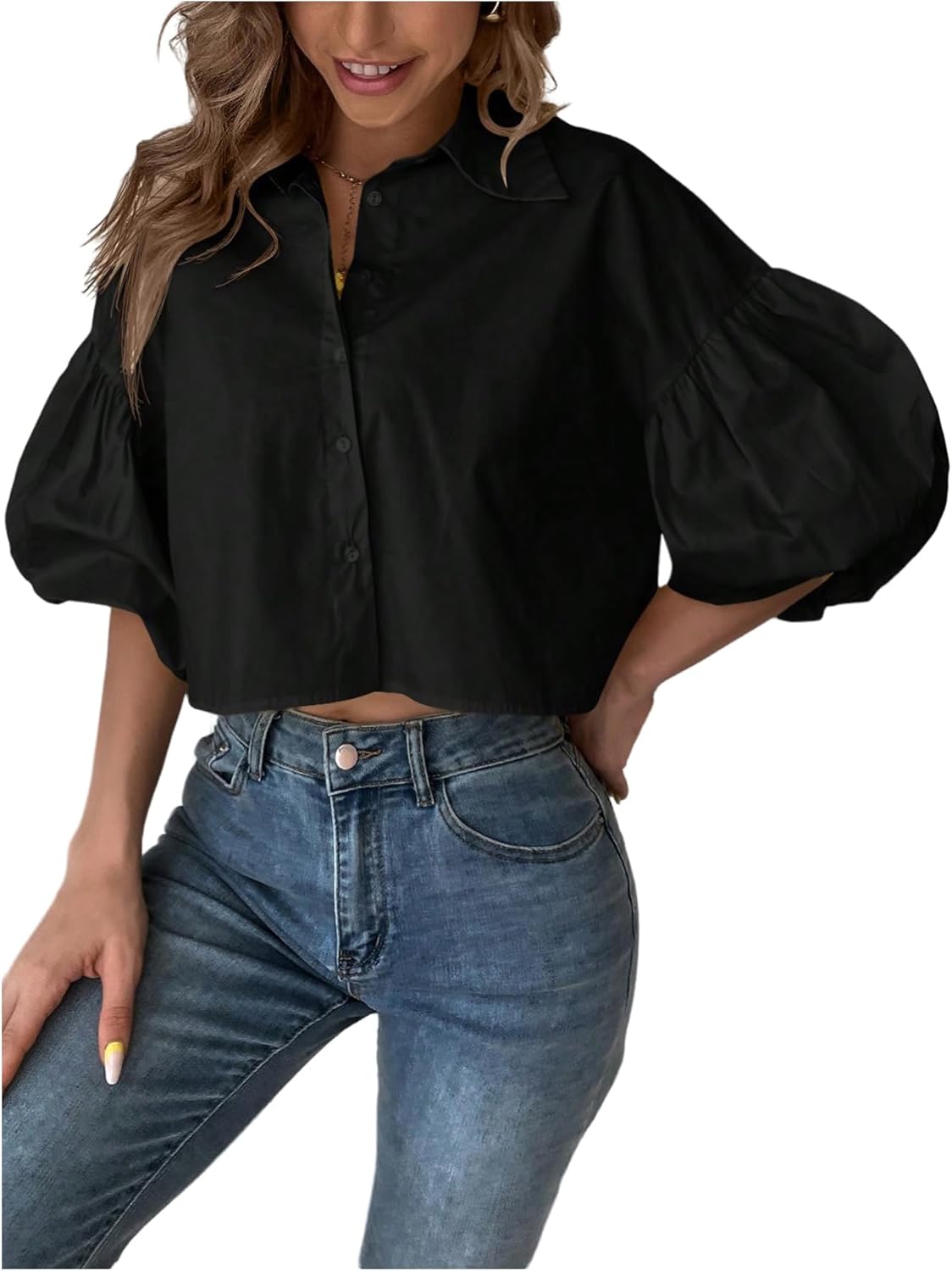SweatyRocks Women's Half Bishop Sleeve Button Down Shirts Summer Dressy Casual Blouses