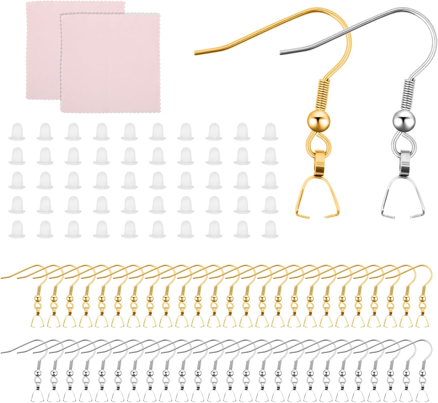 - Earring Making Set: Including 50 earring hooks(25 gold and 25 silver), 50 silicone earbacks, and 2 luxurious suede polishing cloths. Combine the earring making supplies with other jewelry findings to craft beautiful accessories or embellishments.