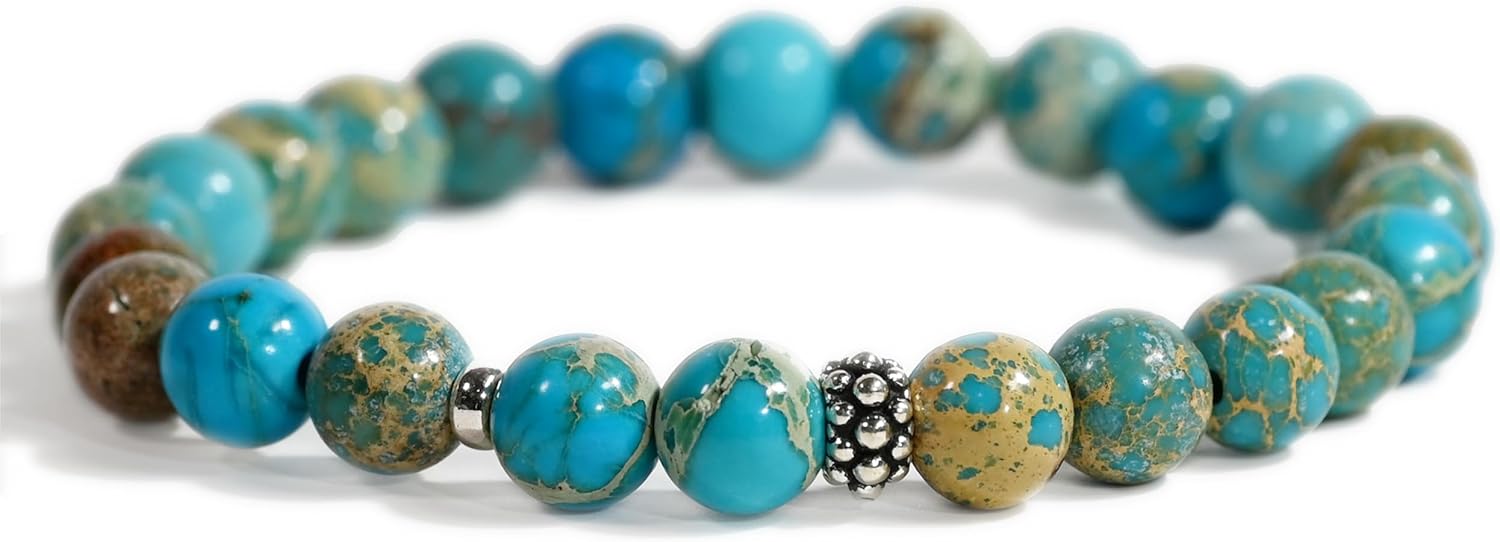 Handmade Natural Gemstone Stretch Bracelet – Turquoise Jasper Indian Agate Aquamarine Moss Agate Fluorite Selenite Quartz – 8mm Beaded Jewelry for Women Men