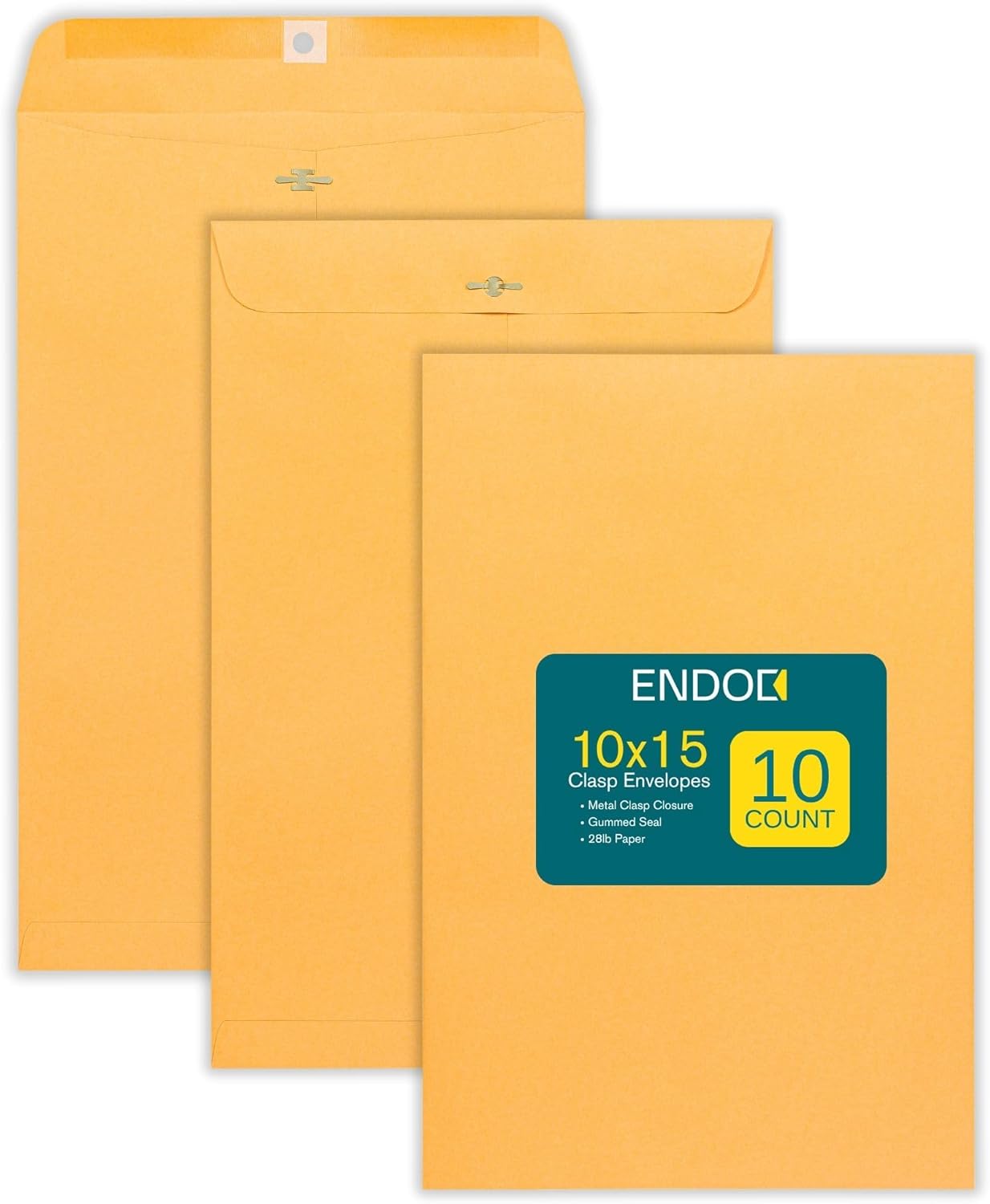 EnDoc 10 x 15 Clasp Envelopes - 10 Pack Brown Kraft Catalog Mailing Gummed Seal Envelope - 28lb Heavyweight 10x15 Inches Manila Envelopes for Home, Office, Business, Legal or School